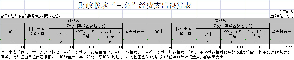 隨州市自然資源和規劃局(匯總)2019年一般公共預算財政撥款“三公”經費支出56.85萬元,其中:1、因公出國(境)費支出6萬元,因公出國(境)人次數1人?。?、公務接待費2.96萬元,國內公務接待62次,接待人數440人;3、本系統公務用車保留29輛,2019年無公務用車購置,公務用車運行維護費47.89萬元。隨州市自然資源和規劃局為2019年4月新組建單位,納入部門決算管理的單位共19個,無上年對比數據。