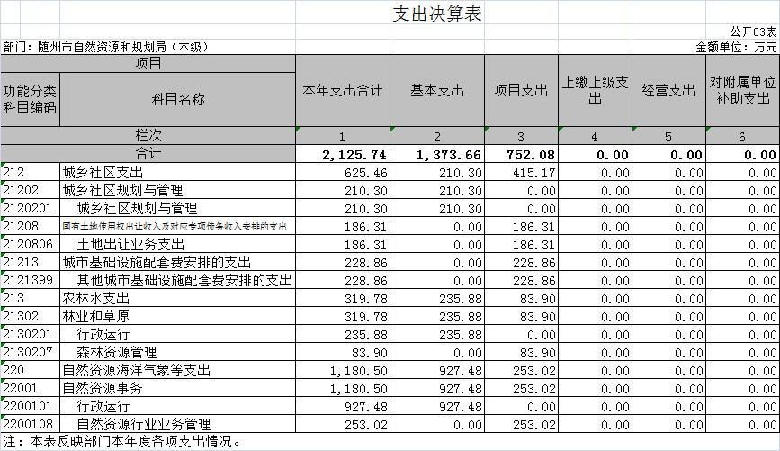 隨州市自然資源和規劃局(本級)2019年度支出總計2125.74萬元,其中基本支出1373.66萬元、項目支出752.08萬元。隨州市自然資源和規劃局為2019年4月新組建單位,無上年對比數據。