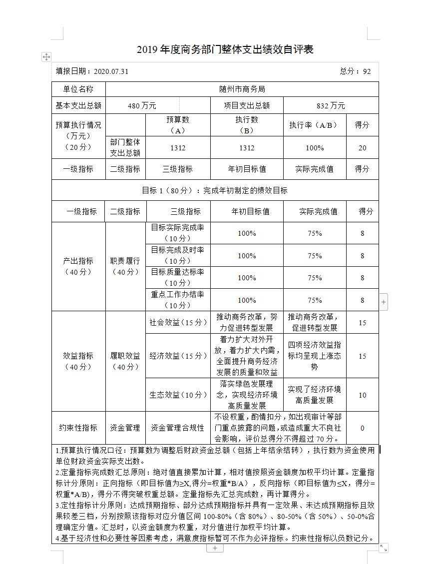 通過設立績效指標,對我單位2019年度整體支出進行績效評估。本次績效自評得分92分,績效評價結果級別為優。