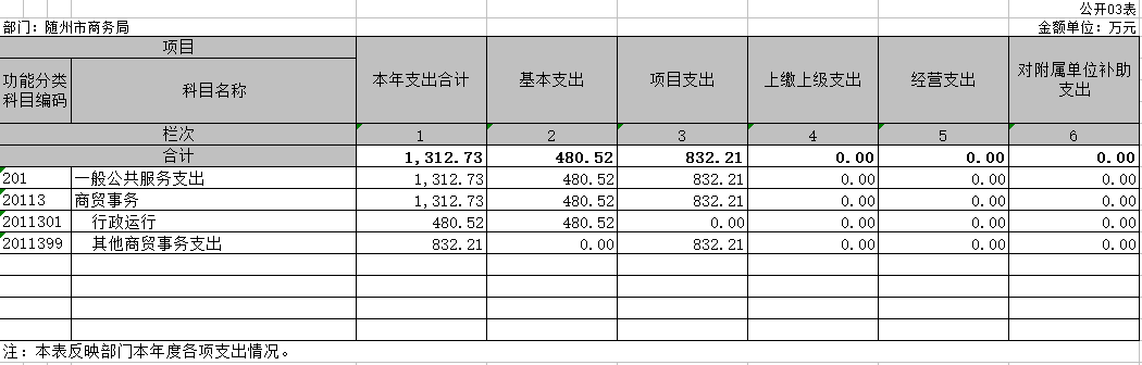 市商務局2019年度基本支出總額預算319.4萬元,按財政要求本部門項目不納入本年度預算,按實際情況一事一報,故年初項目支出總額預算為0。市商務局2018年度實際基本支出總額為480萬元,項目實際支出總額為832萬元。故部門整體預算支出總額為319.4萬元,實際執行總額為1312萬元,執行率100%。