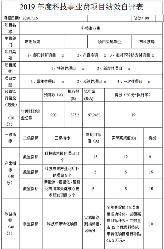 2019年,市財(cái)政局下達(dá)科技事業(yè)費(fèi)預(yù)算指標(biāo)900萬元,實(shí)際執(zhí)行數(shù)875.2萬元,執(zhí)行率97.24%。此項(xiàng)經(jīng)費(fèi)主要用于全市科技創(chuàng)新、成果轉(zhuǎn)化、市校合作業(yè)務(wù)以及科技惠民工作,資金使用績效較高,自評績效得分98分。