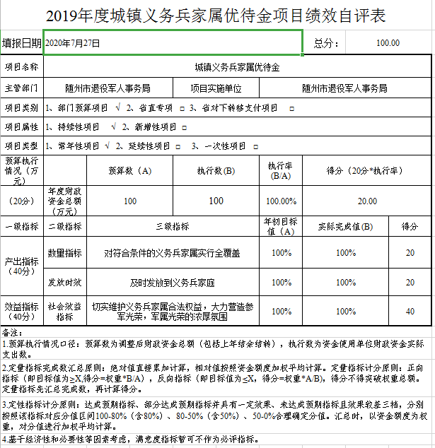 2019年度市退役軍人事務局項目支出年初預算經費撥款(補助)602.67萬元,預算下達602.67萬元,實際支出416萬元。主要產出和效果:根據機構工作職責和年度目標工作任務,以黨建為引領,全面加強機關黨的建設;以服務管理體系建設為突破點,有效夯實退役軍人工作基礎;以政策落實為出發點和落腳點,加快推動退役軍人工作全面發展;以涉軍大局穩定為著力點,努力在化解涉軍信訪矛盾上謀求實效。發現的問題及原因:項目設置不夠細化。主要原因是延續歷年項目,未根據工作需要進行及時調整。下一步改進措施:結合工作實際,合理設置項目。