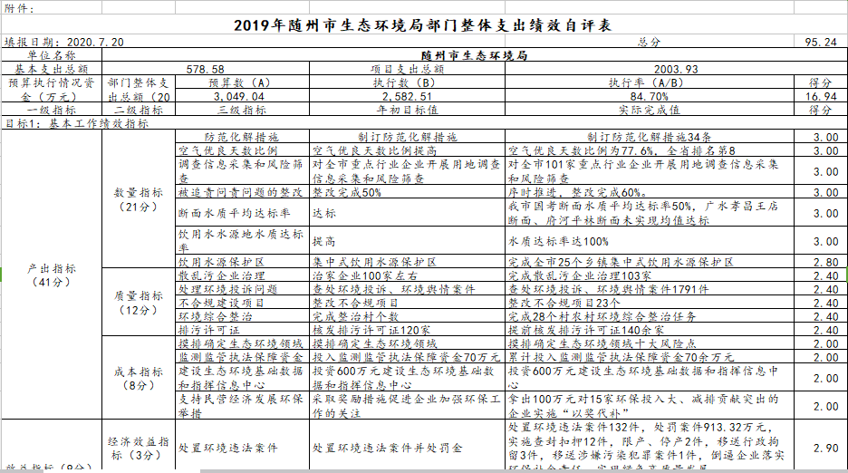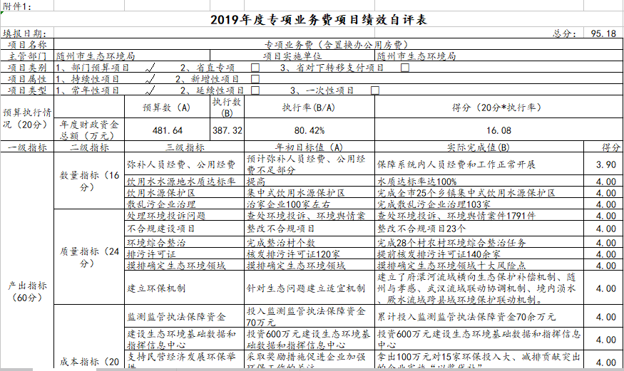 專項業務費項目績效自評:項目全年預算數為481.64萬元,執行數為387.32萬元,完成預算80.42%。主要產出和效果:一是空氣質量省定目標超額完成二是水環境質量達到省考核要求;績效自評工作建議:進一步加大機關運轉經費保障,使各個專項工作目標的實現得到充分保障。