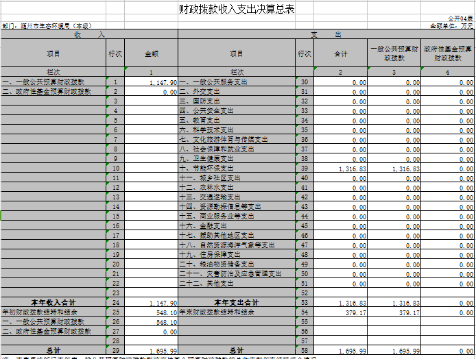 ?? 2019生態環境局系統納入部門算管理單位5個,分別為市生態環境局(含機動車排氣污染監督管理中心)、市環保局曾都分局、市環境監察支隊、市環境保護監測站、市環保局高新園區分局。本級單位行政人員編制23人,實有人員23人,離退休人數14人。市機動車排氣污染監督管理中心(與局機關統一核算)事業人員編制3人,實有人員3人。
