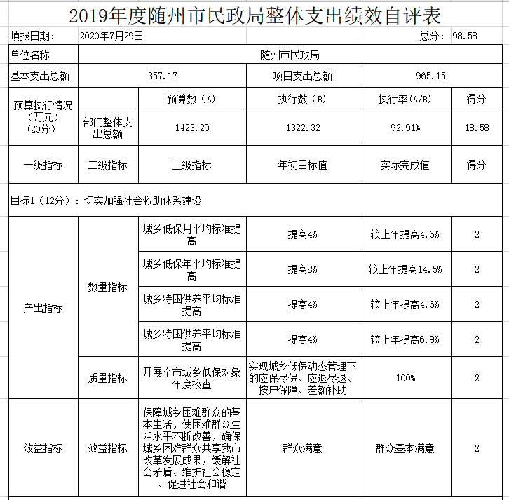 ? 附件:2019年度隨州市民政局整體支出績效自評表