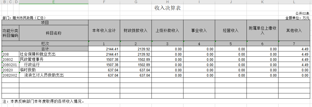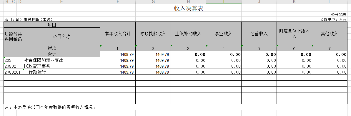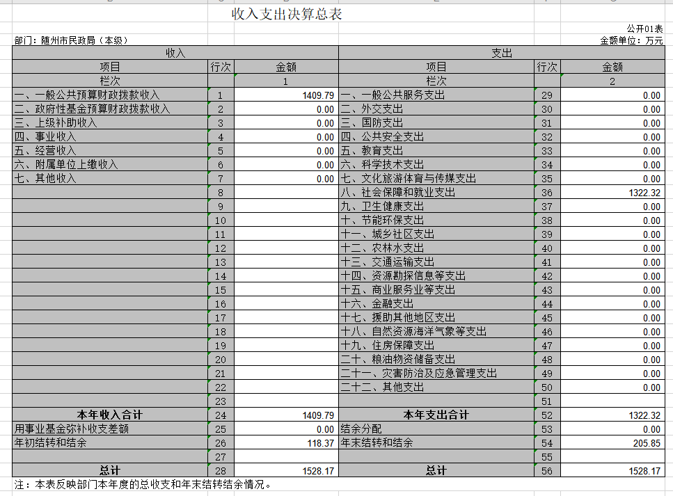 ? 隨州市民政局(本級)2019年度收入總計1528.17萬元,其中財政撥款收入1409.79萬元、年初結轉和結余118.37萬元,收入合計較上年1733.43萬元下降11.84%,主要原因:年初結轉結余減少,因機構改革,項目資金減少。