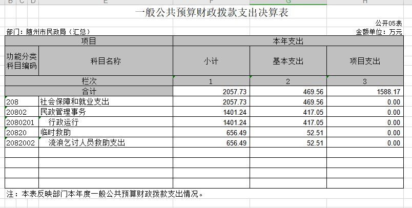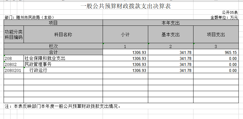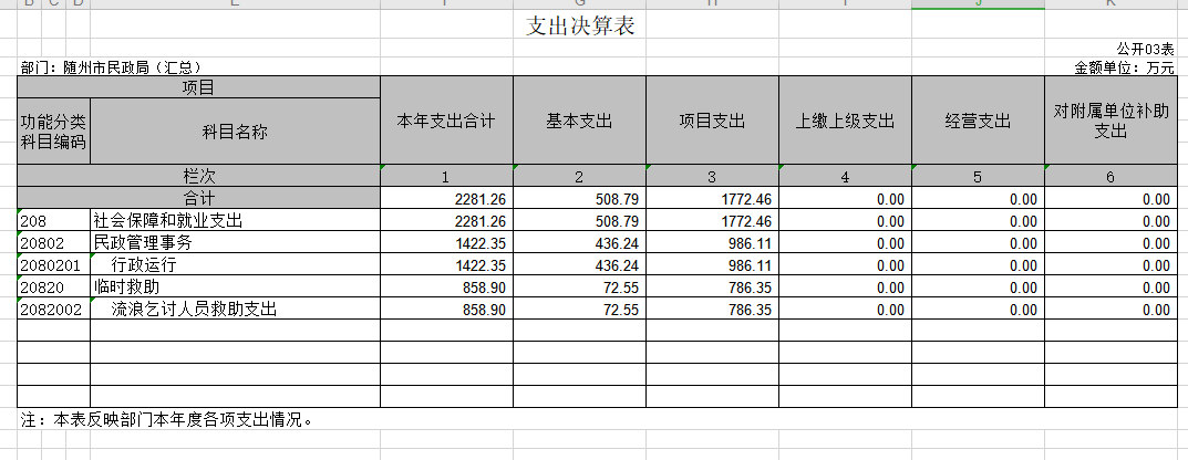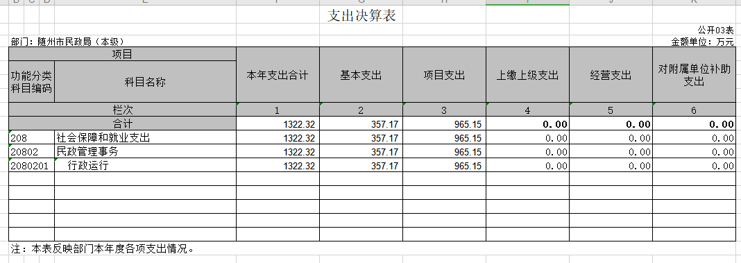 ? 隨州市民政局(匯總)2019年支出總計2851.69萬元,其中本年支出合計2281.26萬元、年末結轉和結余570.43萬元。支出合計較上年5012.12萬元減少43.1%,主要原因:因機構改革,項目資金減少。