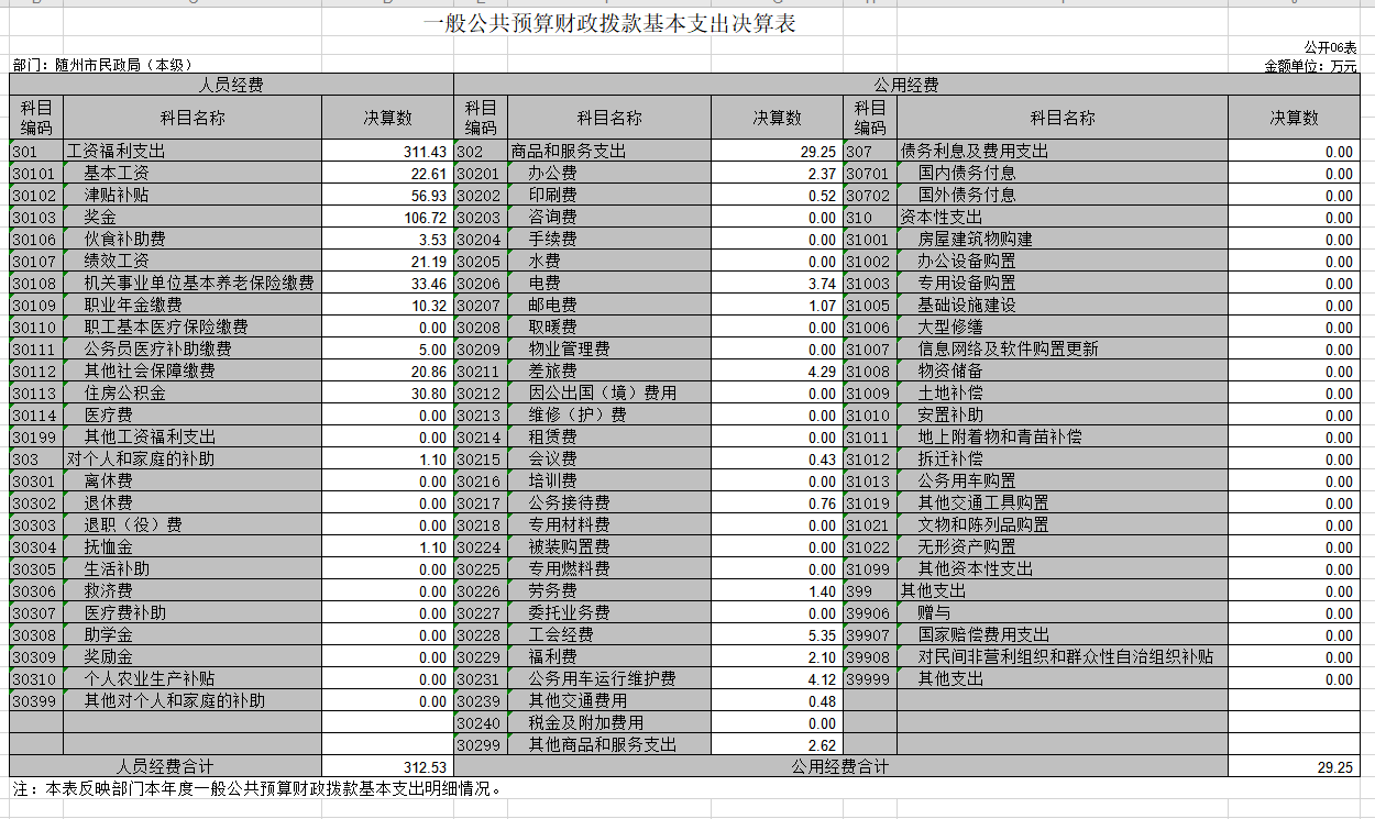 ? 隨州市民政局(匯總)2019年度一般公共預算財政撥款“三公”經費支出年初預算數為31萬元,決算數為6.7萬元,比預算少24.3萬元,減少78.39%,決算數較上年的6.25萬元增加0.45萬元,漲幅7.2%,上下控制在10%內。主要原因為無因公出國開支,嚴格控制三公經費。其中:(1)2019年初預算因公出國(境)費用8萬元,2019年度實際支出0萬元;(2)2019年初預算公務接待費4.56萬元,2019年度實際支出1.28萬元(共接待次數22次,接待人次115人),比預算減少3.28萬元,減少71.93%;(3)2019年年初預算公務用車費18.44萬元,2019年度實際支出公務用車運行維護費5.42萬元,比年初預算減少13.02萬元,減少70.61%。