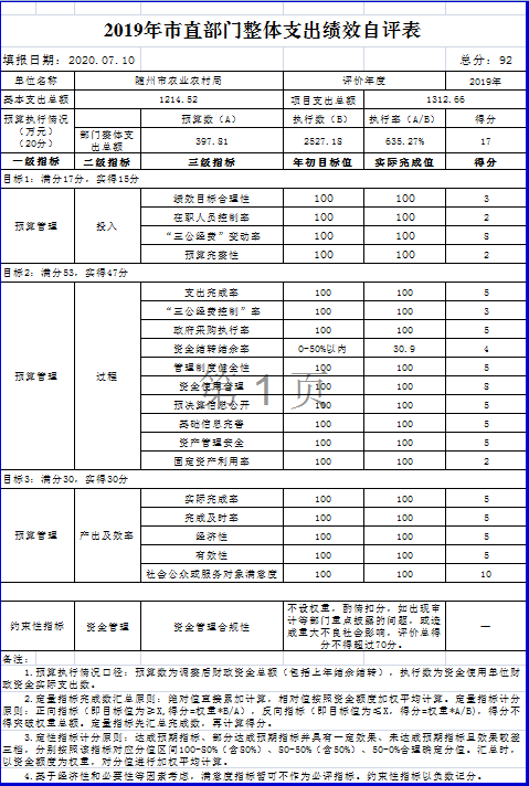 根據《2019年市直部門整體支出績效自評表》中績效目標完成情況評分,隨州市農業局本級2019年部門整體支出績效自評得分92分。