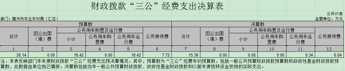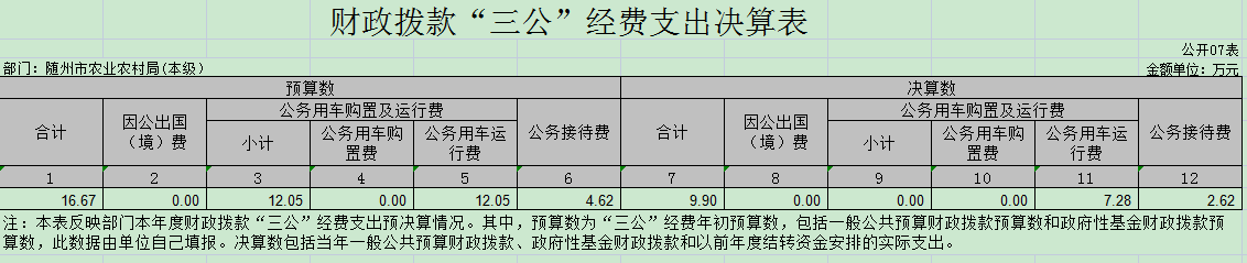 隨州市農業農村局(匯總)2019年度?“三公”經費支出決算數為15.38萬元,比年初預算26.14萬元減少10.76萬元,減少41.16%,主要原因是:19年加強了公務接待的控制及公車的使用管理。其中:(1)2019年初預算因公出國(境)費用0萬元,因今年沒有因公出國(境)的計劃;(2)2019年初預算公務接待費用7.72萬元,2019年度實際支出6.04減少1.68萬元,減少21.76%,共接待112批次,780人。(3)2019年初預算公務用車運行維護費用為18.42萬元,2019年度實際支出為9.34萬元,減少了了49.29%,原因是加強了公車的使用管理。