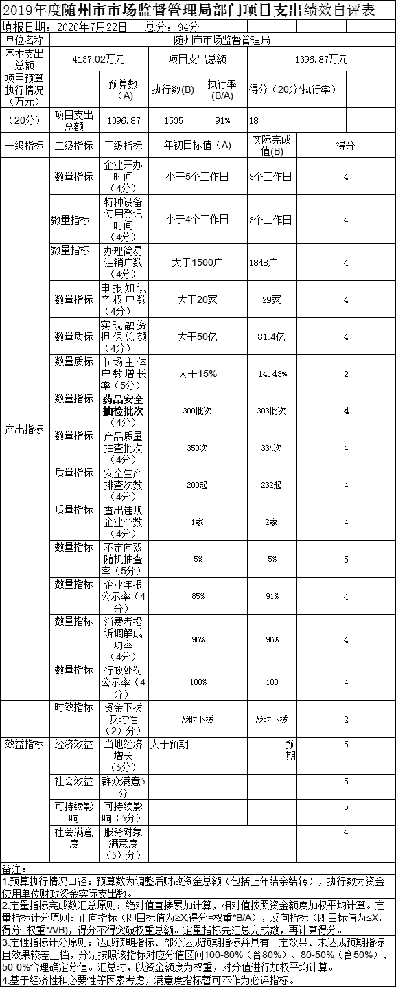 隨州市市場監管局項目績效自評綜述:項目預算金額1535萬元,項目實際支出1396.87萬元,預算執行率91%。主要產出和效益:一是更深層次推進商事制度改革,營造更加寬松便捷的準入環境;二是更大力度服務市場主體發展,激發市場主體發展活力;三是更加有效加強事中事后監管,維護市場公平競爭秩序;四是更實舉措提高消費維權效能,營造安全放心消費環境;五是通過質量提升行動,找準我市企業產品質量共性問題,并為企業提出解決方案,促進我市產品質量提升,形成我市產品特有品牌,推動質量強市戰略。六是開展各類特種設備安全整治、檢查及宣傳等,確保安全生產。七是實施標準化戰略,提高全市工業、農業、服務業標準化工作水平。