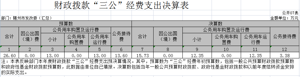 ?? 2019年,隨州市發(fā)改委匯總“三公”經(jīng)費(fèi)支出合計15.73萬元,比上年16.27萬元減少0.54萬元,下降3.32% 。