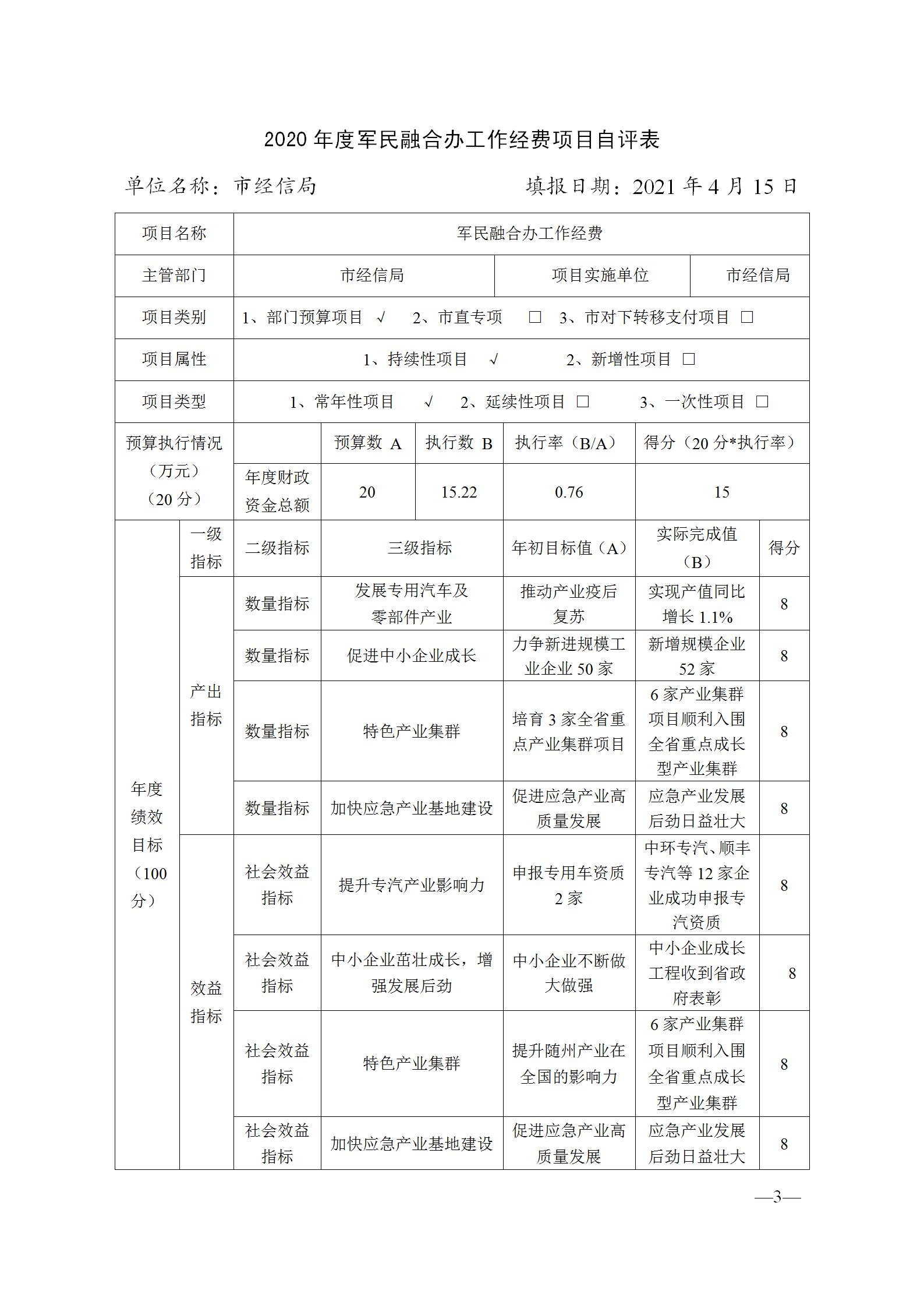 1、軍民融合辦工作經費項目自評綜述:項目全年預算數為20萬元,執行數為15.22萬元,完成預算76.1%。