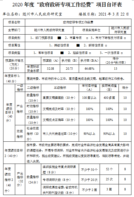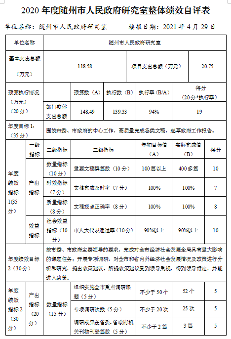 主要產出和效益:高質量起草政府工作報告;圍繞市委、市政府的中心工作,完成各類文稿起草工作;組織實施全市重點調研課題;組織專項調研,調研成果在省委、省政府機關刊物刊登篇數3篇。