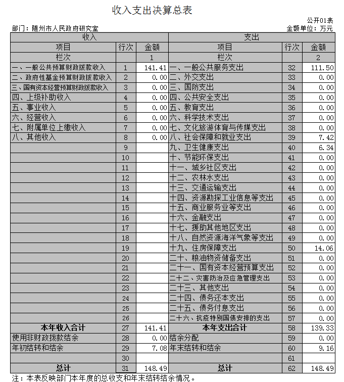 2020年度收入總額148.49萬元,其中:財政撥款(補助)收入141.41萬元,其他收入0萬元,年初結轉結余7.08萬元。
