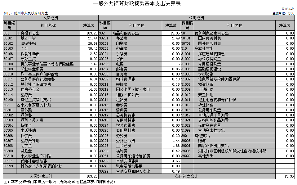 六、一般公共預算財政撥款基本支出決算表(公開表06表)