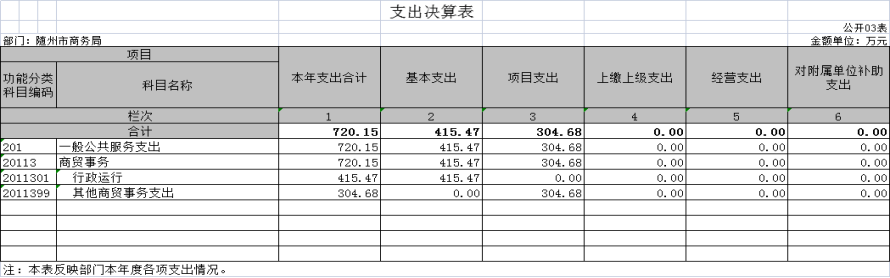 市商務局2020年度基本支出總額預算325.3萬元,按財政要求本部門項目不納入本年度預算,按實際情況一事一報,故年初項目支出總額預算為0。市商務局2020年度實際基本支出總額為415.47萬元,項目實際支出總額為304.68萬元。故部門整體預算支出總額為325.3萬元,實際執行總額為720.15萬元,執行率100%。