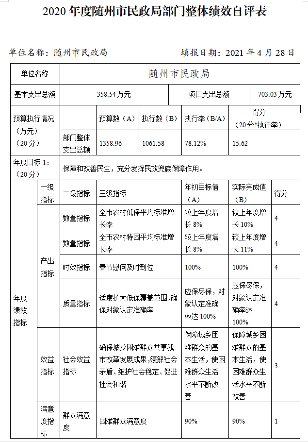 附件:《2020年度隨州市民政局部門整體績效自評表》??