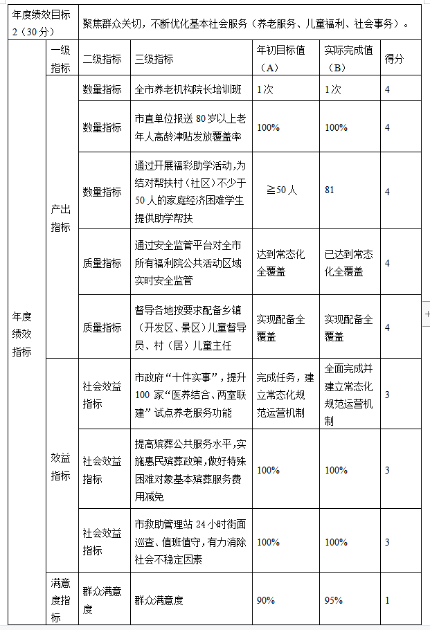 主要產出和效益:支持養老服務體系建設,在全市推動養老機構建設和養老服務質量提升,助推養老事業多元化、多樣化發展,讓我市老年人都能老有所養、老有所依、老有所樂、老有所安。