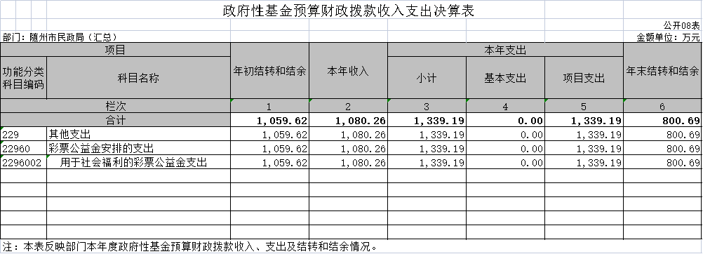 隨州市民政局(匯總)2020年度政府性基金預算本年收入1080.26萬元,較年初預算數1310萬元減少229.74萬元,降幅17.54%,主要原因是2020年福彩收入大幅減少,政府性基金預算收入減少。