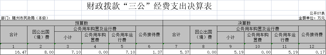 隨州市民政局(本級)2020年度財政撥款“三公”經費年初預算數為16.47萬元,決算數為5.37萬元,比預算數少11.1萬元,降幅67.4%,主要原因是2020年無因公出國(境)支出;決算數較上年的4.88萬元增加10.04%,主要原因是疫情期間,公務用車運行費增加。