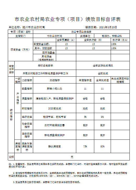 根據預算績效管理要求,本部門組織對2020年度一般公共預算項目支出全面開展績效自評,共涉及項目1個,資金15萬元,支出15萬元,從評價結果來看項目績效評價綜合成績優良,經濟和社會效益良好,財政項目支出合理、規范、有效。
