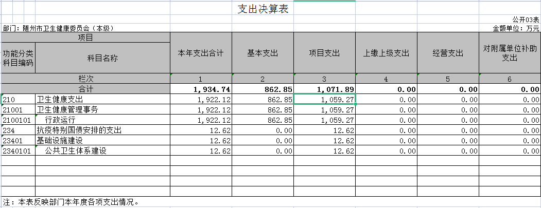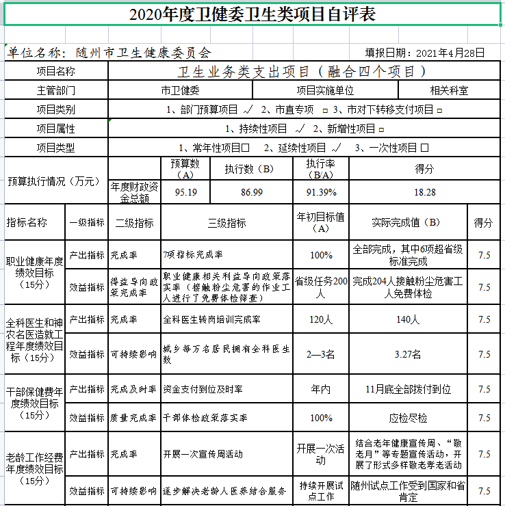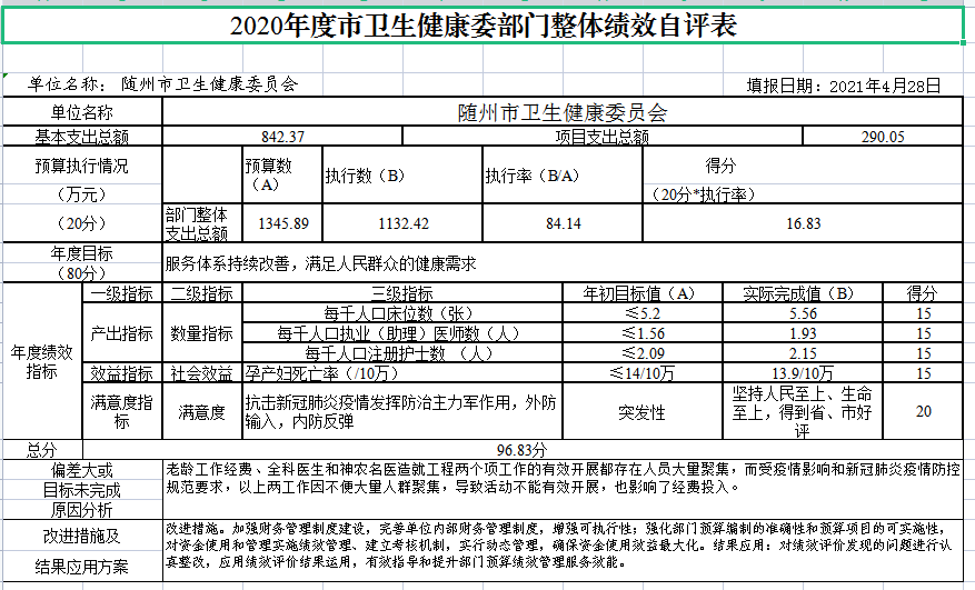 部門支出用于為保障機構正常運轉、完成日常工作任務而發生的支出,包括人員經費和日常公用經費。在新冠肺炎重大疫情時期,確保各項工作順利進行,全面完成了疫情防控和上級下達的其他各項目標責任指標,無越級上訪事件發生,無責任安全事故發生。2020年,市衛健委結合資金預算執行和年度績效完成情況,綜合自評分為96.83分。(詳細自評附下《2020年度隨州市衛生健康委部門整體績效自評表》)