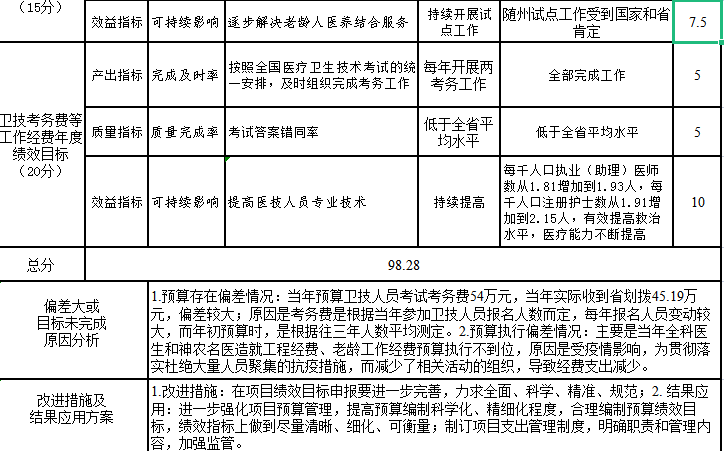二是衛生業務類支出項目是常年性項目。該項目包含五個項目內容:①本級預算安排資金50萬元(分別為職業安全健康監督管理10萬元、全科醫生和神農名醫造就工程15萬元、干部保健費20萬元、老齡工作經費5萬元),其中預算執行情況為職業安全健康監督管理10萬元、全科醫生和神農名醫造就工程7.55萬元、干部保健費20萬元、老齡工作經費2.43萬元,預算執行率79.96%。②衛生考務(含鑒定和黨建、紀檢、文明單位、綜治和檔案等工作)項目,預算安排為納入預算管理的非稅收入,但因當年衛生技術考務費統一在網上向省繳費,再由省統籌各地報名人數向各地市州進行劃撥,列其他支出指標;當年衛生考務費預算為59萬元,省實際下撥資金45.19萬元,實際支出37.01萬元,預算執行率81.9%;預算不精準原因是每年報名參加衛生技術考試人數是動態調整的。經對衛生業務類支出項目自評,自評分為98.28分,詳細績效自評見附表。