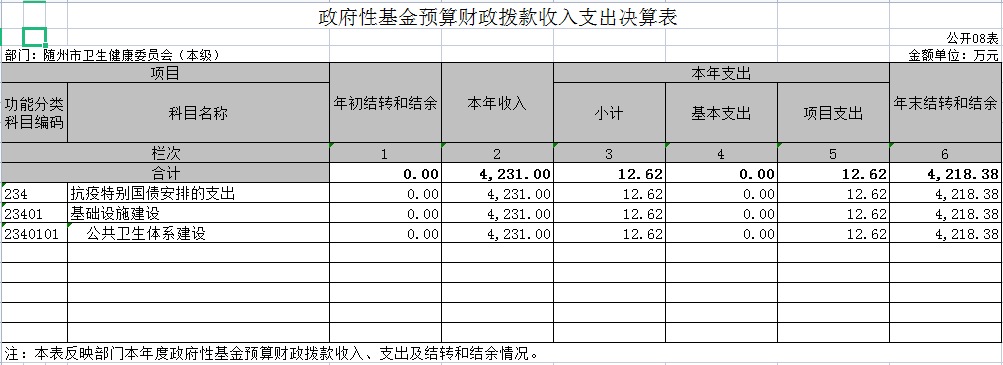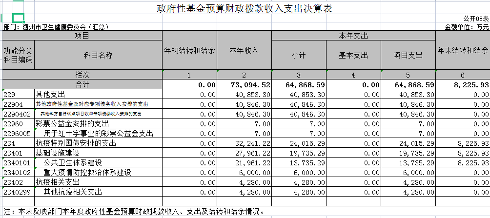 2020年度投入政府性基金預算資金4321萬元,用于“隨州市120急救指揮中心項目”和“隨州市區域醫療一體化信息平臺項目”建設。年末結余資金4218.38萬元。結余原因是:該兩項目是當年立項,目前正處于前期工程申報審批等前期準備工作,工程未正式施工。而按相關規定,項目資金使用必須按工程進度支付。下一步,“隨州市120急救指揮中心”正式成立,工作人員到位后著力推進項目建設,將于2021年底投入使用;督促“隨州市區域醫療一體化信息平臺項目”迅速完成前期準備工作,編排工期,按期完成工程進度,力爭明年投入運行。