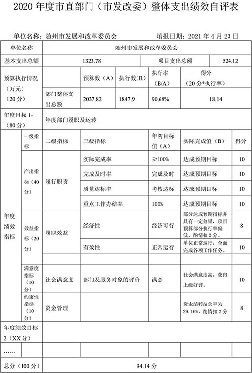 根據預算績效管理要求,本部門組織對2020年度一般公共預算項目支出全面開展績效自評,共涉及項目7個,資金616.38萬元,占一般公共預算項目支出總額的100%。從評價情況來看,經過綜合評定,本年度績效自評得分為94.4分,績效等級為優。??