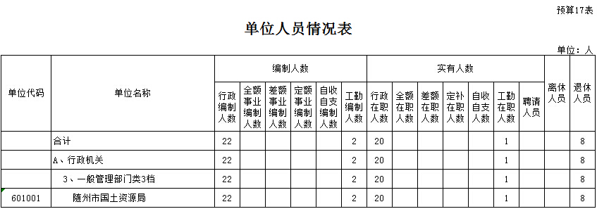 2、市國土資源局屬政府職能部門,為行政編制,公務員編制22人,工勤編制2人。目前行政在職20人,工勤在職人員1人,退休8人。目前新招錄2人,編制還未正式進入單位。