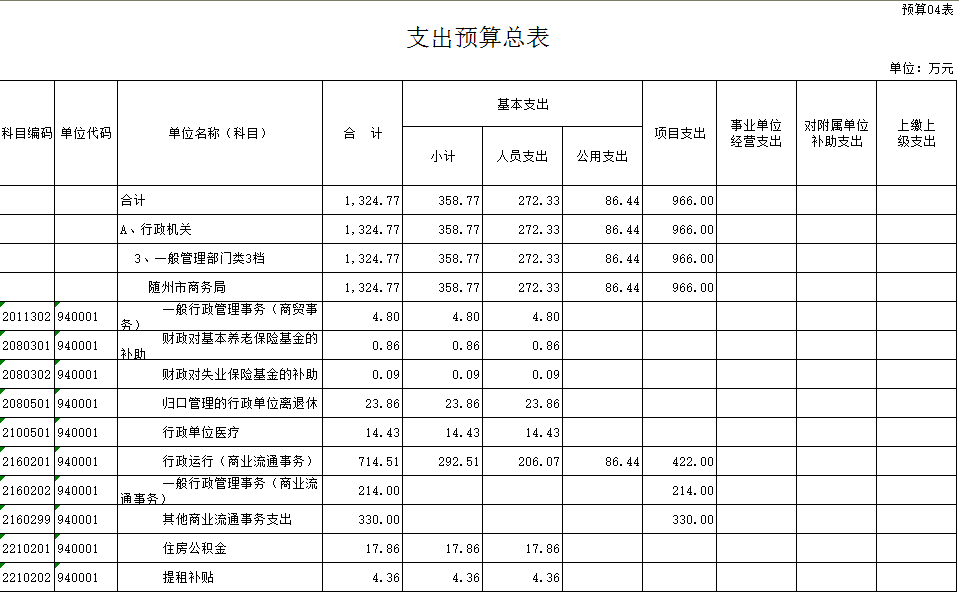 一般公共服務(wù)4.8萬元;社會保障和就業(yè)支出23.4萬元;醫(yī)療衛(wèi)生14.43萬元;商業(yè)服務(wù)業(yè)等支出939.1萬元;住房保障支出22.08萬元。