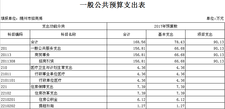 招商局2017年財政撥款支出預算168.56萬元,其中:基本支出78.43萬元,項目支出90.13萬元。按支出功能分,一般公共服務支出156.81萬元,醫療衛生與計劃生育支出4.36萬元,住房保障支出7.39萬元。財政撥款支出較上年增加58.10萬元,同比增長52%,主要是因為2016年公務員薪酬制度改革,用于本年度單位職工薪酬的公共預算財政撥款(補助)增加,另一方面上年招商專班及招商活動結余結轉項目資金。