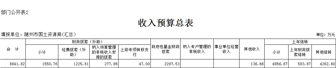隨州市國土資源局2017年度系統匯總收入預算合計8841.82萬元,其中財政撥款(補助)1550.76萬元,政府性基金財政撥款2297.53萬元,其他收入136.86萬元,上年結轉4856.67萬元(上年財政撥款結轉593.87,其他結轉4262.8)