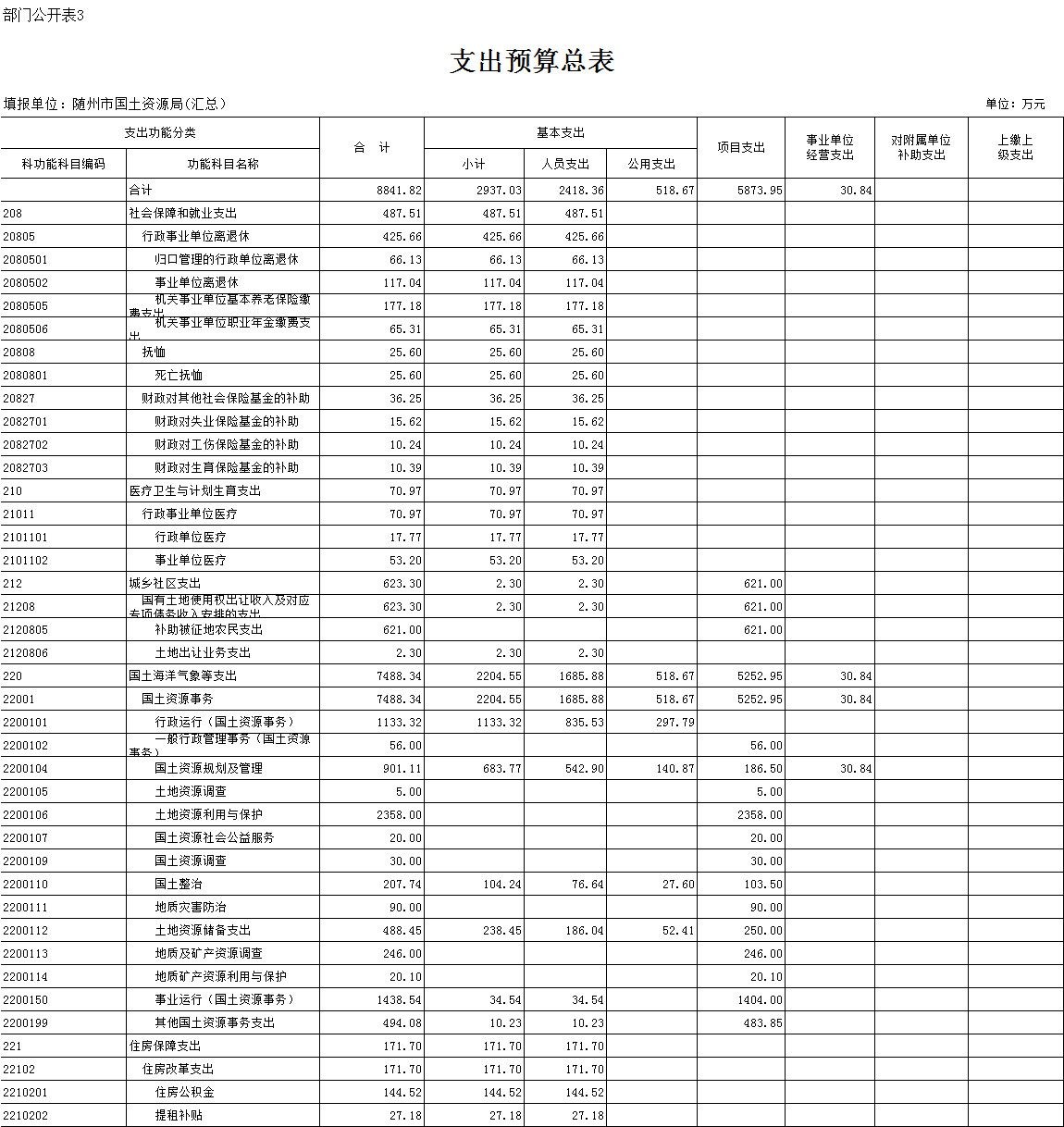 隨州市國土資源局2017年度系統匯總支出預算合計8841.82萬元。其中基本支出2937.03萬元,項目支出5873.95萬元,事業單位經營支出30.84萬元。