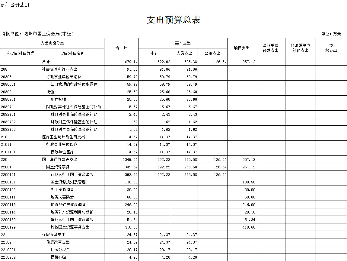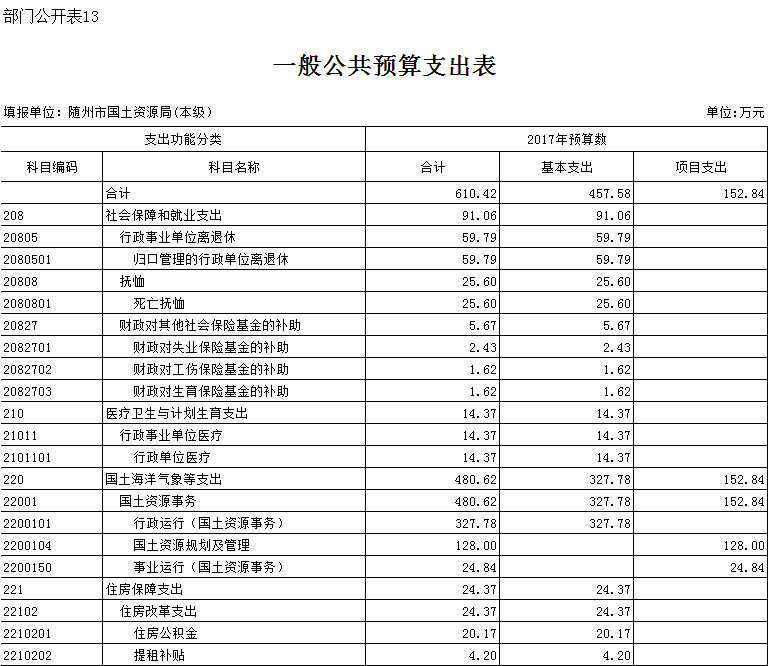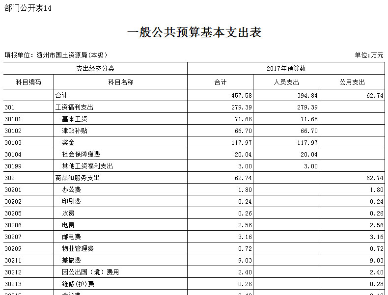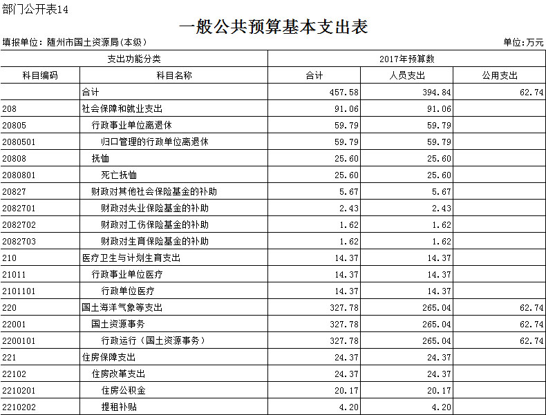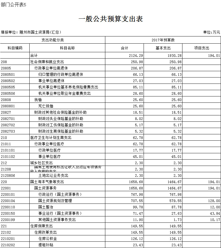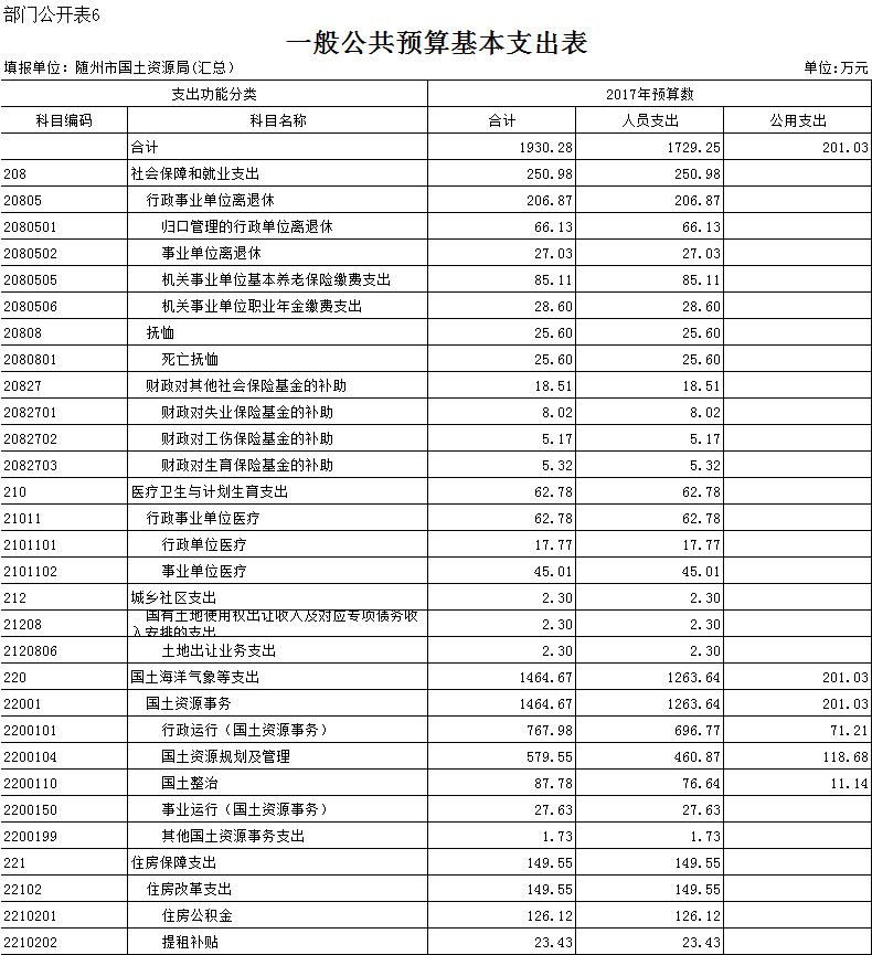 隨州市國土資源局2017年度系統匯總財政經費撥款支出預算合計1225.81萬元,其中人員支出1163.07萬元,日常公用經費支出62.74萬元。