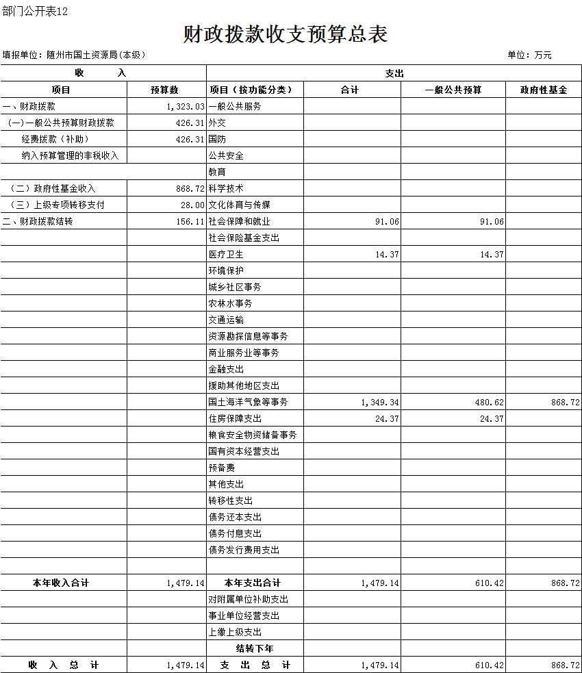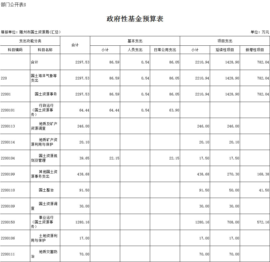 隨州市國土資源局2017年度系統匯總政府性基金預算合計2297.53萬元,其中基本支出86.59萬元,項目支出2210.94萬元。