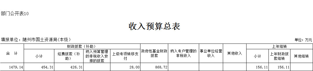 隨州市國土資源局本級2017年度收入預算合計1479.14萬元,其中經費撥款(補助)426.31萬元,上級專項轉移支付28萬元(省基本農田保護??睿?,政府性基金收入868.72萬元,財政撥款結轉156.11萬元。比上年度預算收入總額(2040.77萬元)減少561.63萬元,減少比例27.52% 。