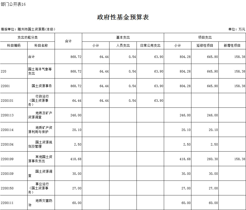 隨州市國土資源局本級2017年度政府性基金預算合計868.72萬元,其中基本支出64.44萬元,項目支出804.28萬元,比上年度預算總額安排(1196.2萬元)減少327.48萬元,減少比例27.38%。