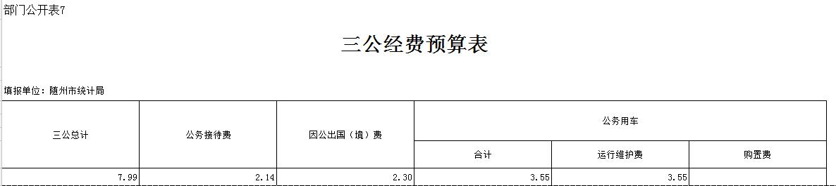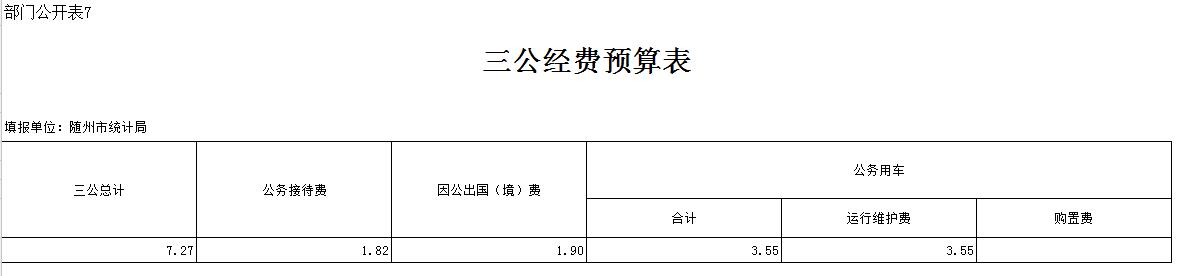 2017年度,隨州市統(tǒng)計(jì)局三公經(jīng)費(fèi)預(yù)算7.99萬元(其中局本級7.27萬元),其中,公務(wù)接待費(fèi)2.14萬元,因公出國(境)費(fèi)2.3萬元,公務(wù)用車3.55萬元。2017年度三公經(jīng)費(fèi)比去年預(yù)算減少35.62萬元,減少82%。主要原因是1.公車改革,公務(wù)用車費(fèi)用減少13萬元,2017年也未預(yù)算公務(wù)用車購置費(fèi);2.因公出國(境)計(jì)劃減少,因公出國(境)費(fèi)減少2.7萬元;3.公務(wù)接待費(fèi)略有增加0.34萬元,主要是農(nóng)業(yè)普查等工作上級調(diào)研和縣市局匯報增加。