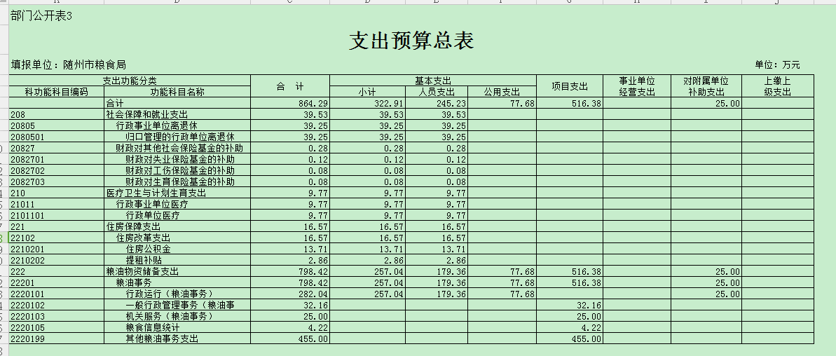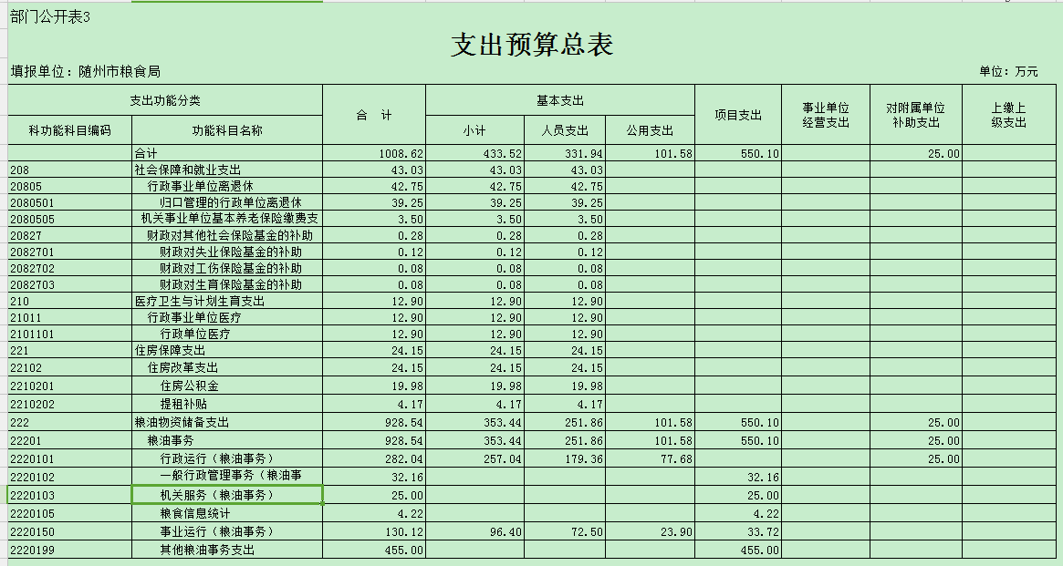 2220199糧油物資儲備支出(類)糧油事務(款)其他糧油事務支出(項):指市糧食局其他用于糧油事務方面的支出。