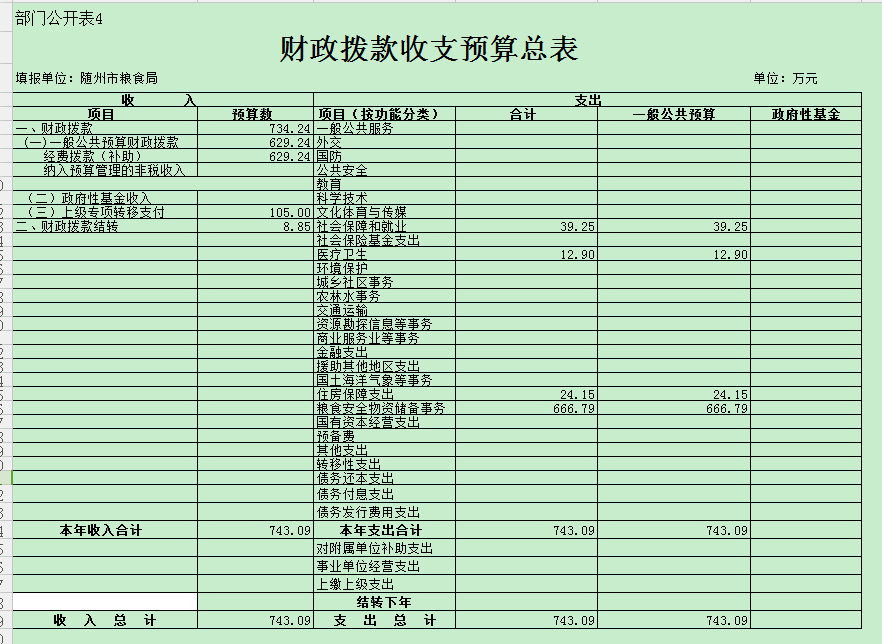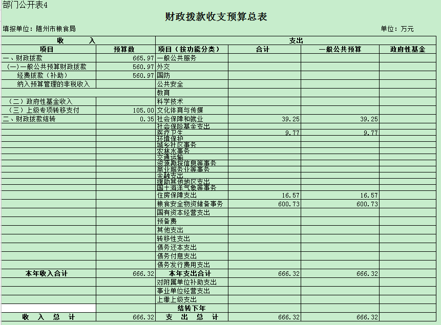 財政撥款支出預算總數為734.24萬元。其中市糧食局本級為666.32萬元。①退休人員工資39.25萬元;②行政單位醫療9.77萬元;③住房公積金13.71萬元;④提租補貼2.86萬元;⑤行政運行212.73萬元;⑥其他糧油事物支出388萬元(其中上級專項轉移支付105萬元)。較上年預算安排497.65萬元增加168.67萬元(含財政結轉0.35萬元),增加支出主要原因是上級專項轉移支出和人員經費有所增加。