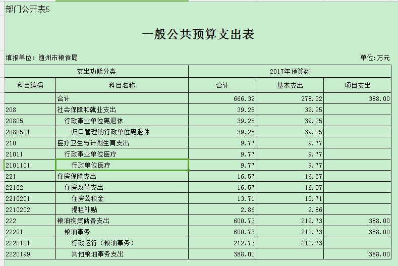 2220104糧油物資儲備支出(類)糧油事務(款)糧食財務與審計支出(項):指市糧食部門為管理各類糧食而進行的財務與審計支出。