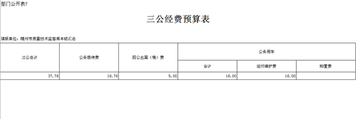 2017年隨州市質(zhì)量技術監(jiān)督局本級匯總“三公”經(jīng)費年初預算安排80.84萬元,含一般公共預算安排37.76萬元。其中: