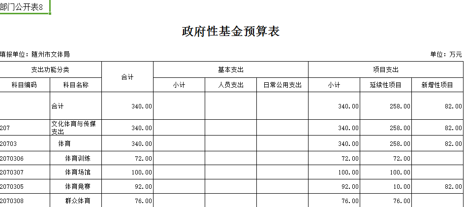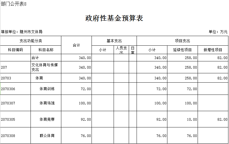 2017年預(yù)算中,財政預(yù)算隨州市文化體育新聞出版廣電局340萬政府性基金,全部用于開支發(fā)展體育事業(yè),體育訓(xùn)練72萬,體育場館100萬,體育競賽92萬,群眾體育76萬。比上年政府性基金增多162萬,增長91。01%!