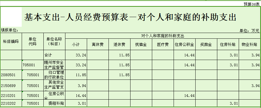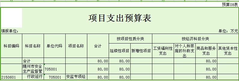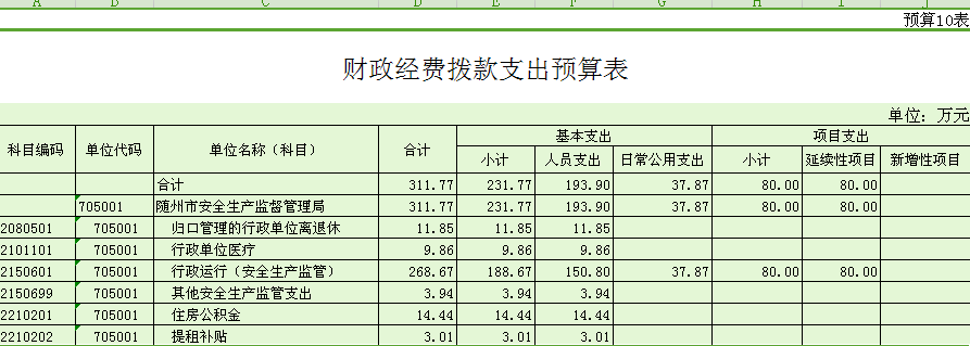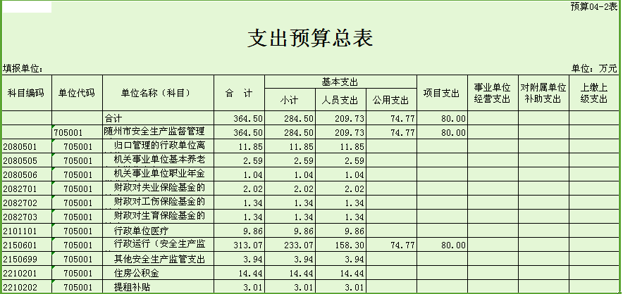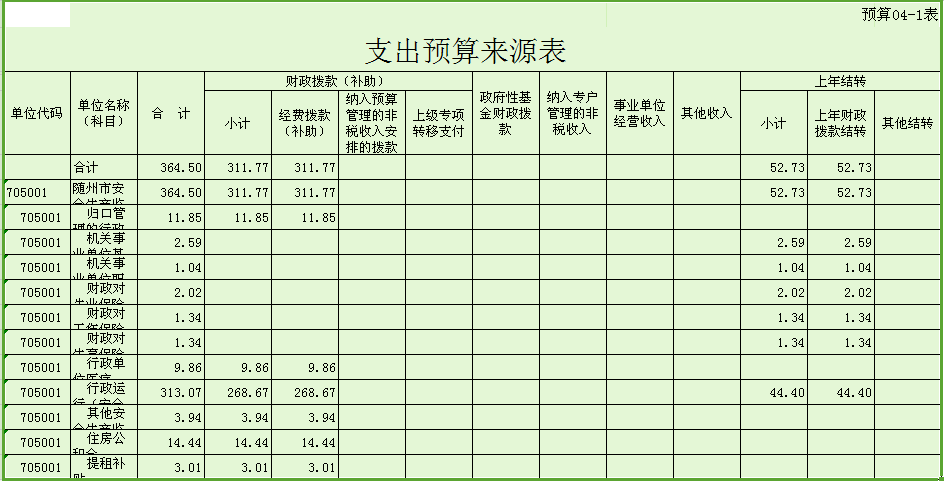 安監局預算支出364.50萬元:其中社會保障和就業20.18萬元、醫療衛生9.86萬元、資源勘探信息等事物317.01、住房保障支出17.45萬元。