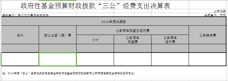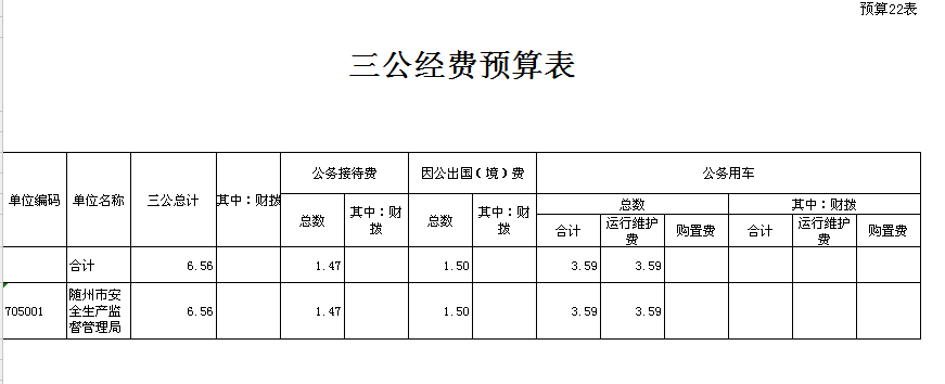 安監局“三公”經費預算6.56萬元:其中公務接待費1.47萬元、因公出國(境)費1.5萬元,與去年相比增加了2%、主要原因是公務接待人次稍有增加。公務用車運行維護費3.59萬元,與去年相比減少了24%,主要原因是公車改革后公務用車運行維護費減少。公務用車上繳5臺,機關只保留2臺執法用車。