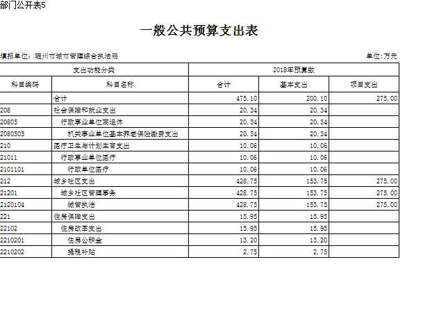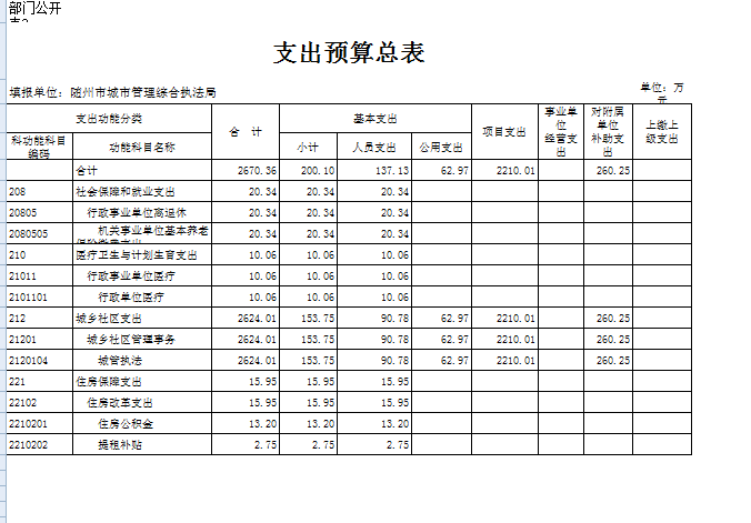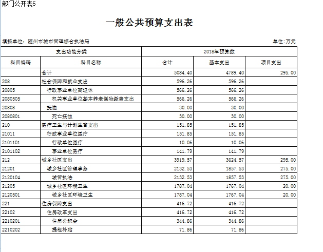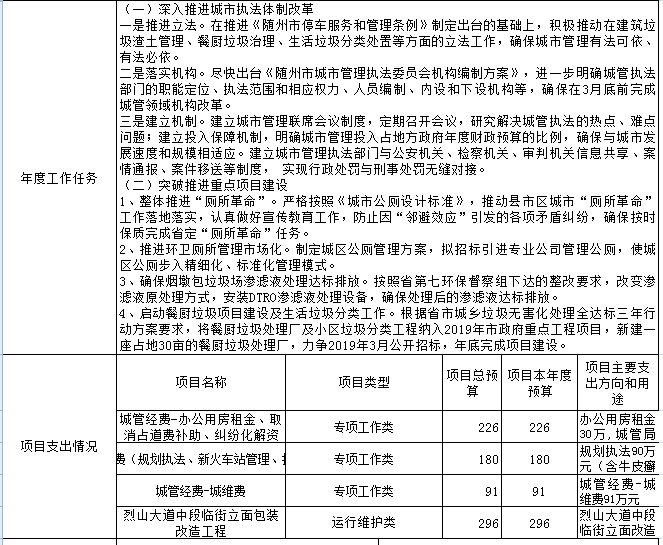 2018年本級財政支出2670.36萬元,其中基本支出200.10萬元,增加了3.42萬元,較上年增加2%,主要用于人員工資、公用經費和社會保障繳費的支出,是由于工資及社會保障繳費上調;對附屬單位補助支出260.25萬元,較上年減少5%,主要是經費不足;項目支出2210.01萬元,較上年增加1022.78萬元,主要用于數字城管建設及城區旱廁改造等延續性工程,項目支出占支出總額的82%,前期工程已經完成,等待驗收付款。
