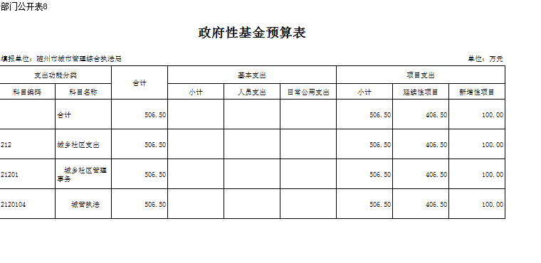 2018年城管局本級政府性基金506.50萬元,延續性項目406.50萬元,比去年增加了項目經費100萬元,比上年增加15%,主要是延續性項目增加及取消收費補助、新增工作人員辦公費。