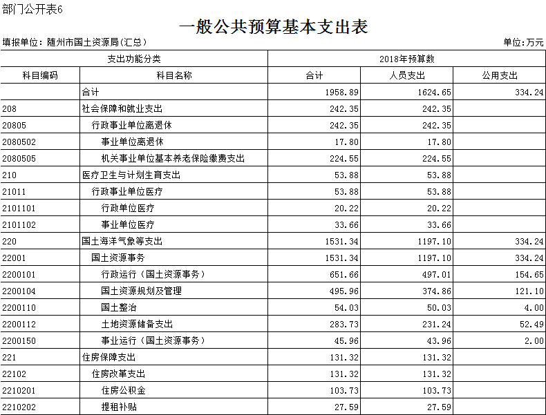 隨州市國土資源局2018年度本級行政編制22人,工勤編制2人。一般管理部門類3檔。目前行政在職人員21人,工勤在職人員1人,以錢養事1人,退休人員11人。